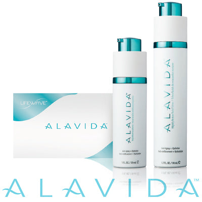 Contains (2) Alavida patch sleeve with 30 patches, (1) bottle of Daily Refresh Facial Nectar, and (1) bottle of Nightly Restore Facial Créme.